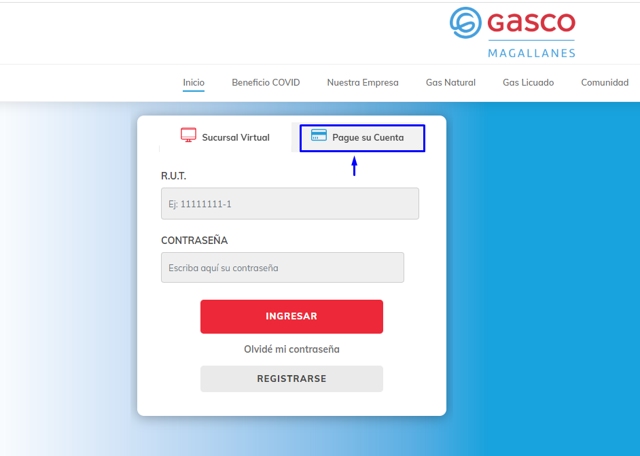 - Haga clic en «Pague su factura» icono de color azul, en la esquina superior izquierda para pagar gas magallanes.